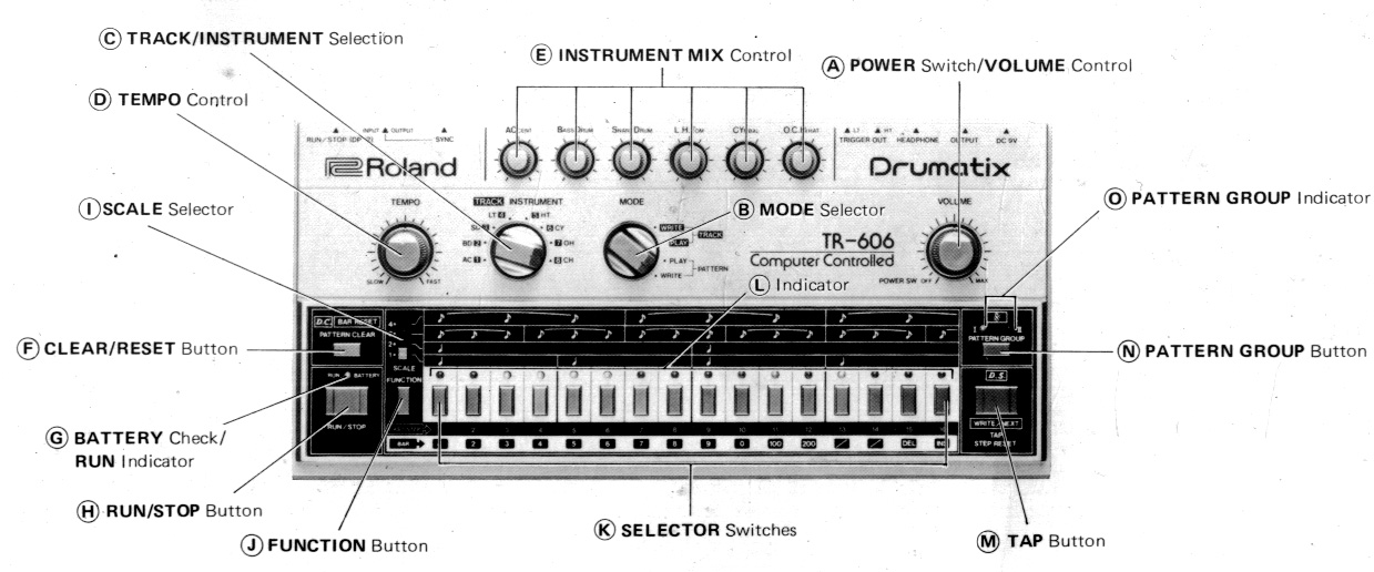Description: The Roland TR-606 is a portable, economical, automatic and fully programmable rhythm device, which can memorize your own rhythms with exceptional flexibility. With it you can write and record different percussive rhythms into non-volatile memory (battery back-up), with up to seven different drum sounds plus accent. Then you can adjust the volume of each percussion sound with individual level controls for full flexibility over the final mix. (Taken from the users manual).