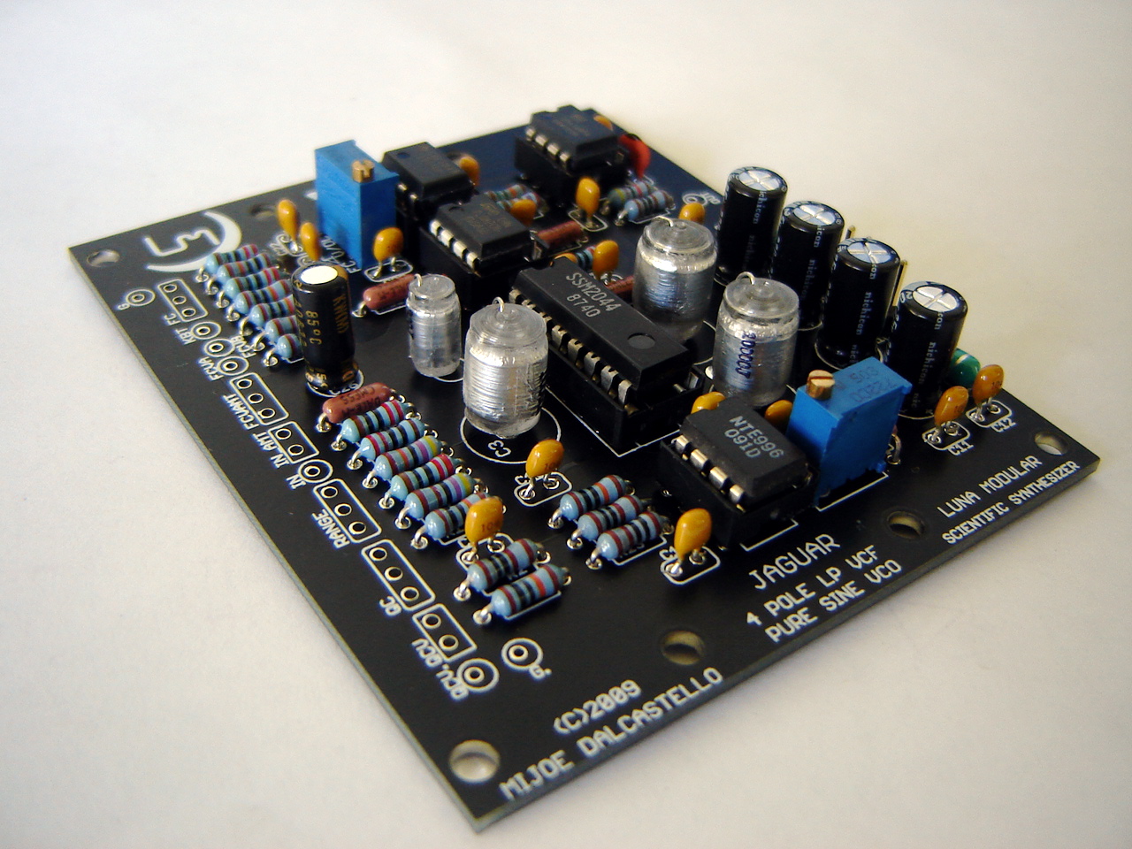 Description: Super low pass vcf based around the ssm2044 IC. Ultra quiet signal path with zero distortion, massive frequency range with vc linear resonance. Pure sine wave VCO when in self-oscillation with 1v/oct cv. Frequency ranges from below 10hz to above 20khz - ouch! PCB comes assembled , pots and sockets to be soldered, blank PCB available on request email me. All components and PCB RoSH compliant & Lead Free, all components and ICs high quality with tolerances at 1%. Kit comes with solid metal shaft Alpha pots.Requires a regulated 12/15v+/- suitable for frac and euro systems. Designed for the discerning synth user that requires nothing the best and them some. Go to somaticcircuits.com