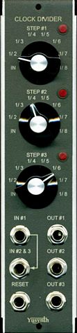 Description: From Yusynth.net: This module is meant to be a complement of step sequencers or to be used to trigger events at regular beats. It provides a way of clocking up to three step sequencers at various rates from a single external master clock, the master clock rate can be divided by 1 (unchanged rate), 2, 3, 4, 5, 6, 7 or 8 independently on the three dividers.