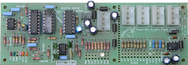 This module is a very standard pseudo-random digital noise source with a few enhancements. Instead of running a fixed high frequency clock, a VCO is used instead, allowing for unusual sweeps, and for reducing the speed right down to a series of random pulses. The internal linear VCO can also be bypassed so an external source such as a 1V/oct VCO or LFO can be substituted. It has pink and white noise outputs, and two separate (unique) digital outputs for use in triggering other circuits.
