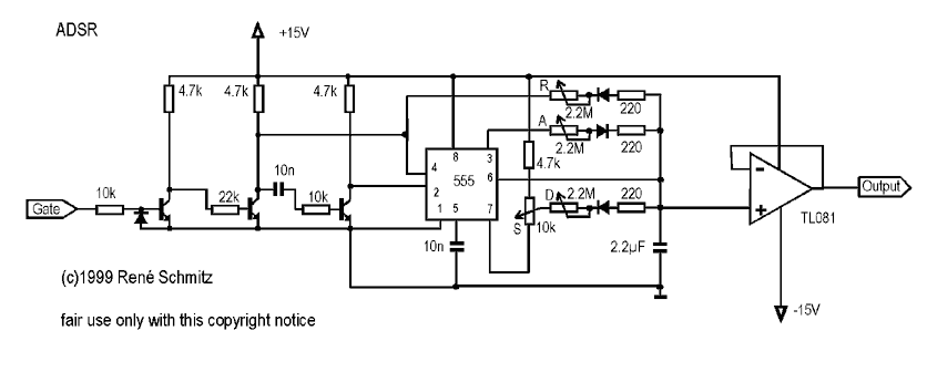 Description: The second image shows a much simpler ADSR which uses a 555 timer IC to do nearly all what is needed. It is preceeded by a transistor circuit which buffers the input and generates a short pulse which is needed to trigger the timer. This is the circuit that I now use, since it has more musical properties. Unlike the first circuit the attack portion of the ADSR goes immideately to decay when the gate goes low. In the first circuit the attack (once triggered) goes until the 10V threshold is reached, regardless of gate going low. This circuit was modified from a circuit from Hal Chamberlins book Musical applications of microprocessors.