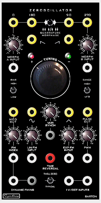 The Zeroscillator is a full-featured electronic-music-quality analog VCO capable of linear frequency modulation through zero hertz and into negative frequencies. This makes it capable of the FM Synthesis stuff, wild and crazy sounds simply not available from traditional VCOs, and timbres not available from digital FM synthesizers. Of course, Zeroscillators also make insane LFOs!