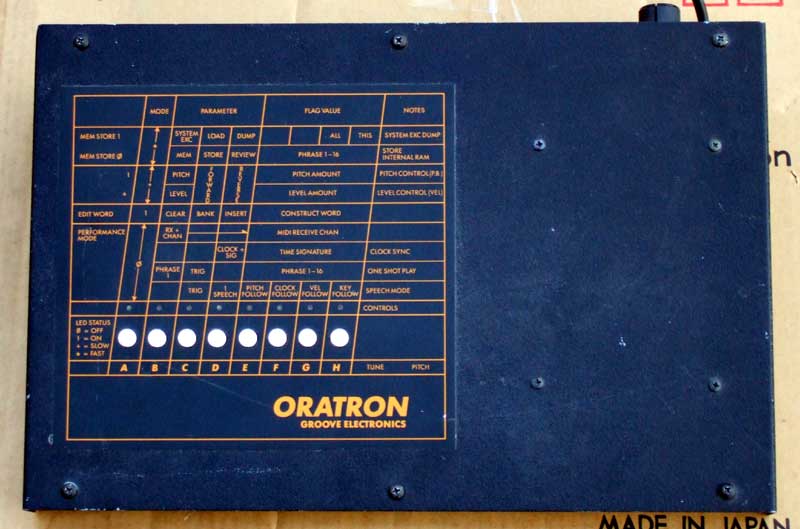 There are some stored phrases though, which ive never been able to edit or overwrite - such things as "Welcome to Groove Electronics", "I am not a man, i am an Oratron", some others, and a curious one, which, i guess may have been some private joke of the time "Can i pop your lemon?"