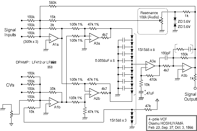 | Schematics for the VCF98 4-pole VCF by Osamu Hoshuyama | |