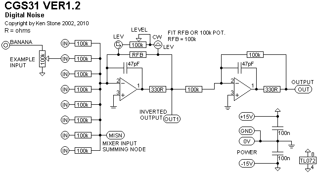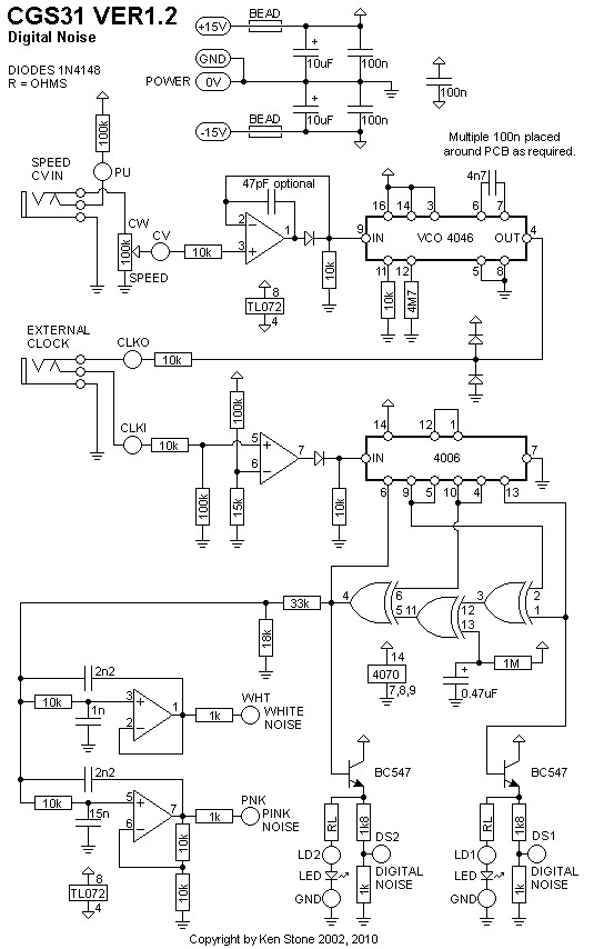 This module is a very standard pseudo-random digital noise source with a few enhancements. Instead of running a fixed high frequency clock, a VCO is used instead, allowing for unusual sweeps, and for reducing the speed right down to a series of random pulses. The internal linear VCO can also be bypassed so an external source such as a 1V/oct VCO or LFO can be substituted. It has pink and white noise outputs, and two separate (unique) digital outputs for use in triggering other circuits.