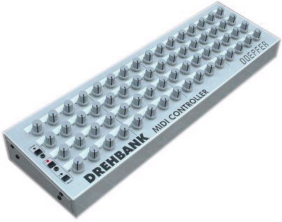 64 rotary controls (rotary potentiometers) Configuration with the free editor program for PC2 user defined setups (banks) available within the device.additionally 8 fixed factory setupsSnapshot function (= send off all 64 control positions)8 CV inputs for external control voltages 0...+5V (e.g. from A-100 modules) or foot controller, normalized 1/4" jack sockets at the rear panel, each external input in use switches off one of the 8 rotary controls at the right side of the front panel.MIDI outMIDI In with merging feature, i.e. incoming MIDI events are merged with the MIDI data generated by Drehbank.3 control buttons with LEDsWhite label (21x8 mm) above each knob for manual inscription or for sticking on self-adhesive labels19" support for rack mounting and 1 HU 19" blind panelexternal AC adapter for power supplyprice: Euro 399.00 (i.e. about US$ 400.00)