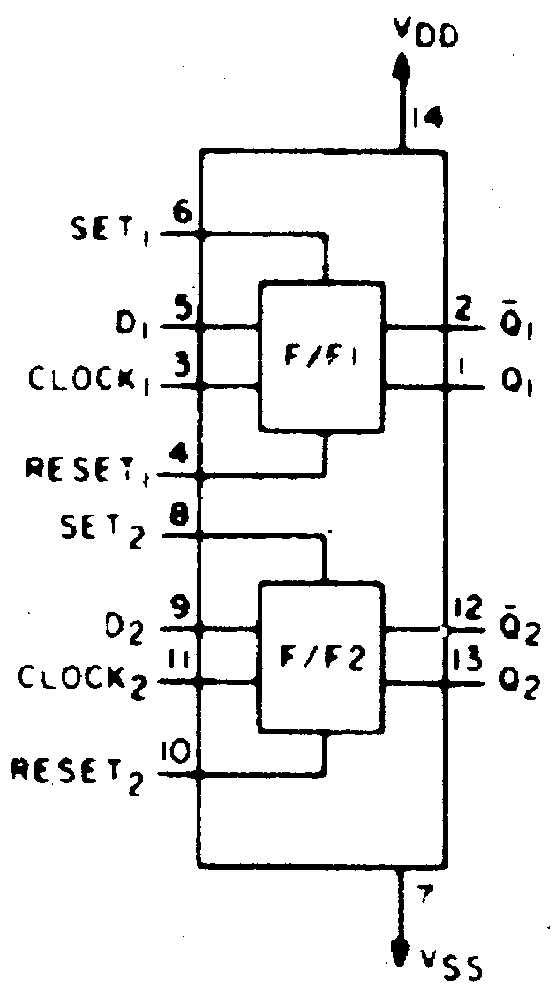 | Picture showing the signal flow and pinconfiguration of the 4013 | |